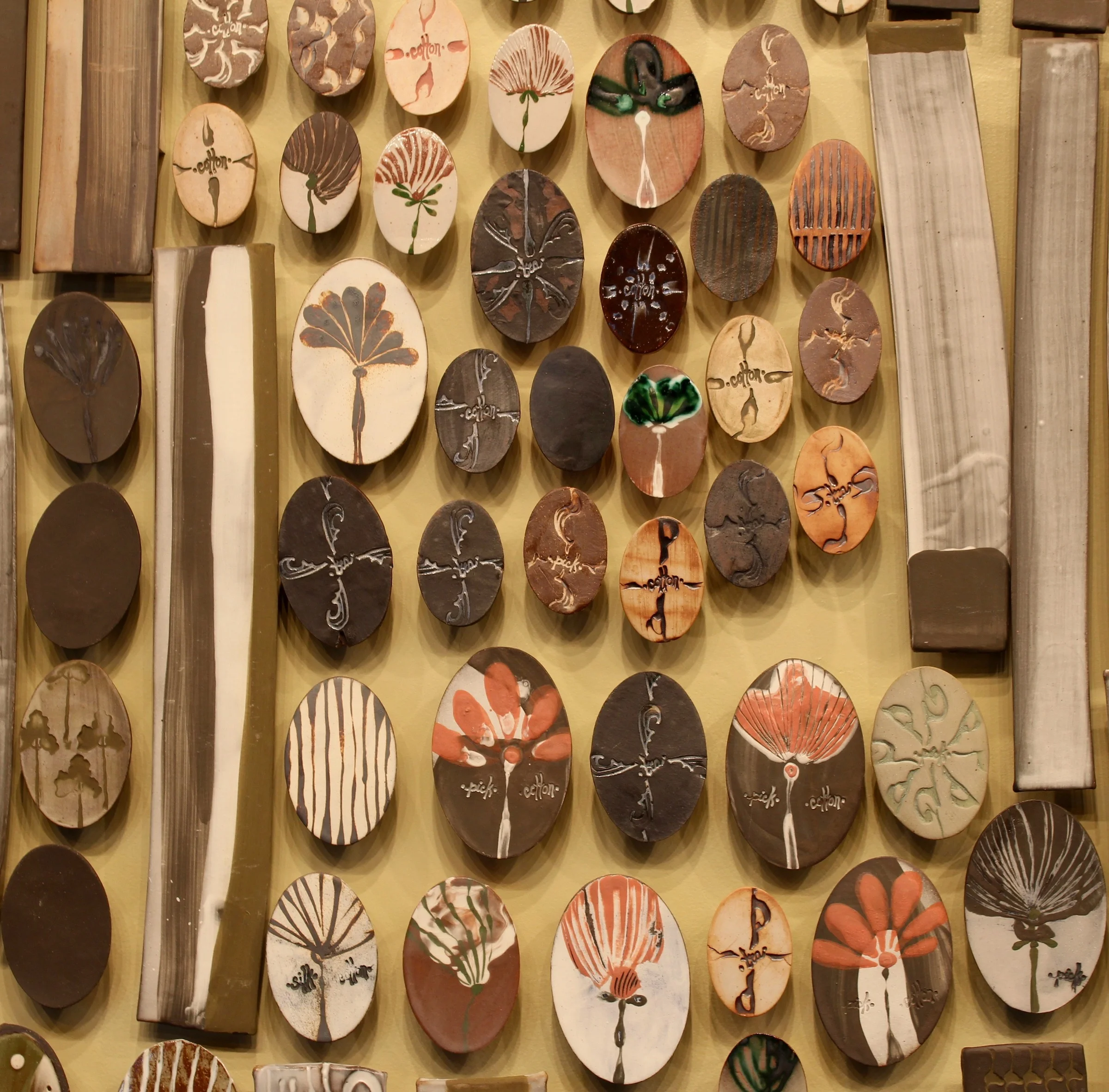 Detail - Coded Memory Quilt: ‘for Tuktuki and Matu, our time together in Jorhat, Assam’, Stoneware, Porcelain, Black Clay Slip, Cone 04 Oxidation, Cone 6 Oxidation, Cone 10 Reduction, 6’ x 5’.8” x 1.5” (dimensions variable), 2018 Chotsani Elaine Dean
